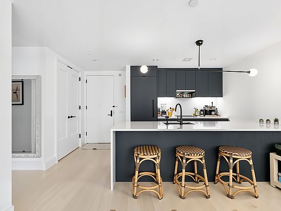 Residents enjoy full-service condominium amenities, including a 24/7 doorman and concierge, fitness center, residents' lounge with billiards and catering kitchen, screening room, children's playroom, landscaped terrace with grilling area, and bicycle storage.