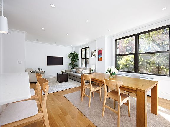 Enter through a gracious foyer with two closets into the expansive living and dining area, where abundant natural light pours in through large south-facing windows onto the lovely tree lined block. The side-by-side living room and dining room layout accommodates a dining table for six while also allowing for generous living space.