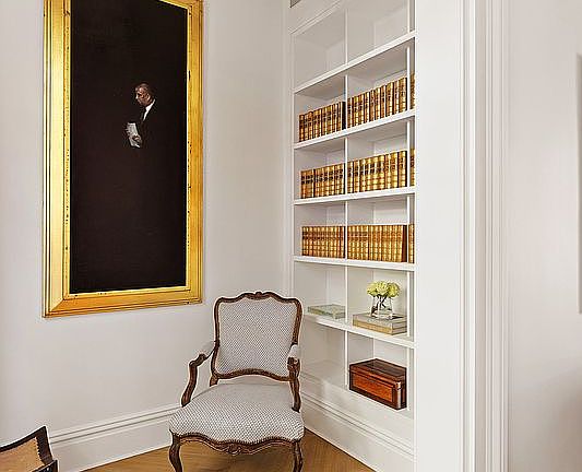That authenticity of the facade inspired the interior architecture, resulting in classical and modern design: French luxury meets New York chic in details such as a Louis XVI fireplace, bespoke marble mantels, beaux-arts–inspired moldings, high ceilings throughout and chevron-laid oak floors reminiscent of Haussmann’s Paris. The sweeping staircase and moldings, based on Beaux Arts design, anchor the interiors with quiet grandeur.