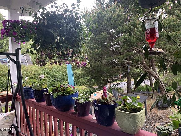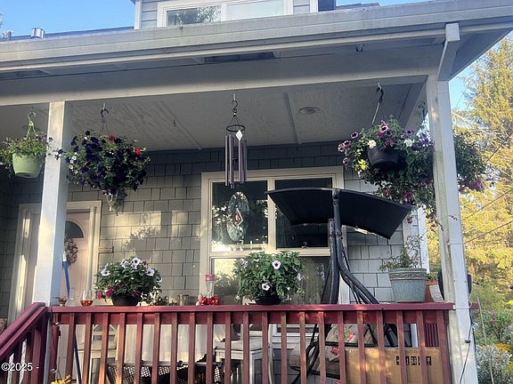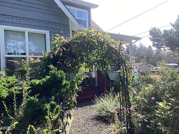 Beautiful two-story home within walking distance to the beach and park, surrounded by lush gardens of hydrangeas, rhododendrons, roses, jasmine, and more. Enjoy two inviting porches and a separate mother-in-law apartment with kitchen, bath, sleeping area, and closets—rents for 1,300/month or perfect as an office or guest suite. A converted studio garage can easily be returned to a two-car garage with opener. The main floor master offers garden views, jacuzzi soaking tub, shower, walk-in closet, and new carpet. Upstairs are two bedrooms—one with a peekaboo ocean view—plus a full bath and laundry room. Lovingly maintained, this home is in excellent condition. An additional lot with its own address and utilities is also available for purchase.