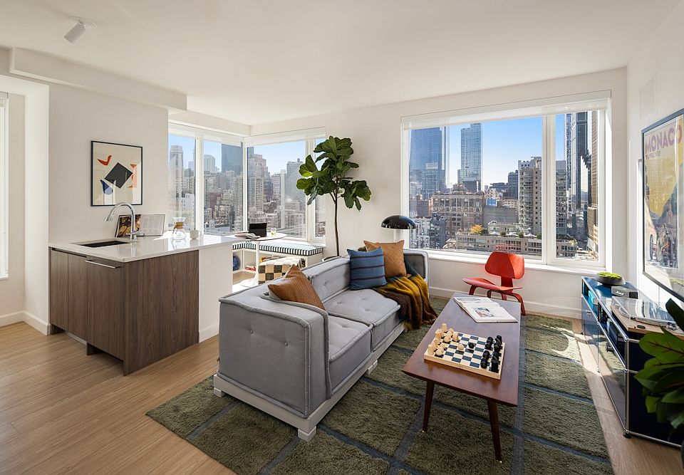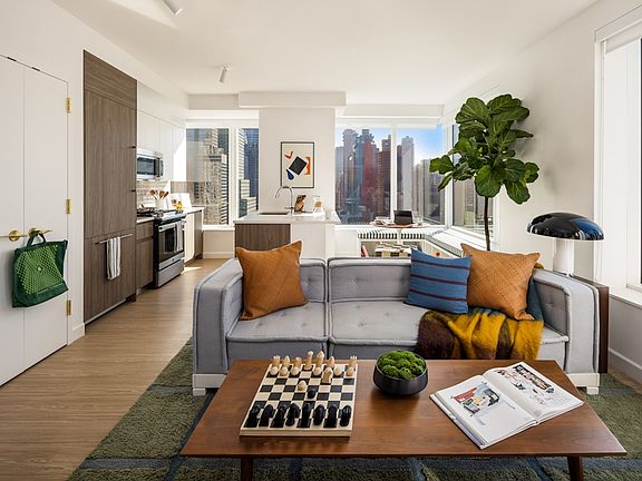 This corner two bedroom, two bath apartment is thoughtfully designed with high-end finishes that immediately invite you in. The gourmet windowed kitchen is fully equipped with quartz counter-tops and peninsula, beveled and polished slate subway tiling, white lacquer and ash grain cabinetry, top-of-the-line appliances and ample storage. For your additional convenience, this home is complete with an in-unit washer and dryer. The living room is generous in space with double exposure and wrap around windows highlighting your impressive views of the Hudson River, Empire State building and the classic New Yorker sign. Both bedrooms will accommodate a King-size bed. The primary is complete with large en-suite, double vanity and both bathrooms are outfitted with a gorgeous mosaic tile, fluted porcelain accent wall and an abundance of storage.