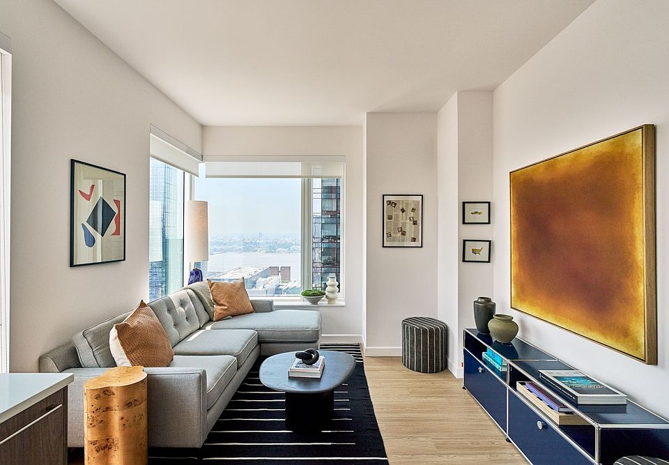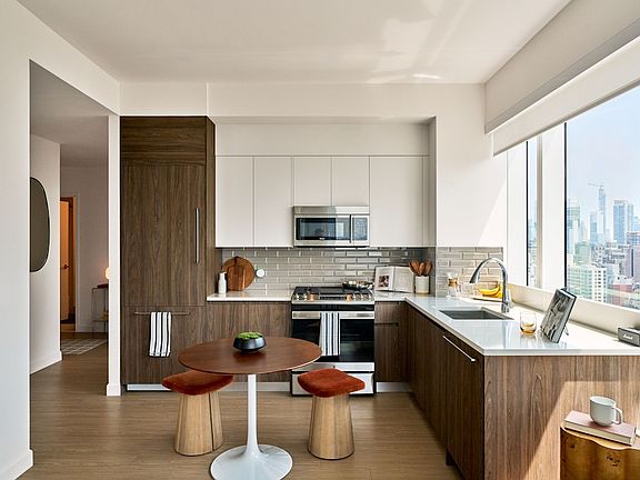 This beautiful cornered two-bedroom apartment is thoughtfully designed with high-end finishes that immediately immerse you in luxury and style. The gourmet windowed L-shaped kitchen is fully equipped with quartz counter-tops, beveled and polished slate subway tiling, white lacquer and ash grain cabinetry, top-of-the-line appliances and ample storage. For your additional convenience, this home is complete with an in-unit washer and dryer. The living room is charming, well-appointed and complete with double paned windows with additional sound proofing only adding to your stunning views of the Empire State building, Hudson River and the classic New Yorker sign. Both bedrooms will accommodate a King-size bed, and the luxurious bathroom is outfitted with a gorgeous mosaic tile, fluted porcelain accent wall and an abundance of storage.