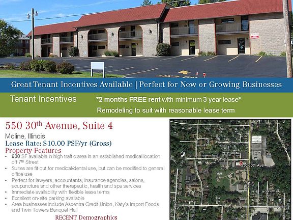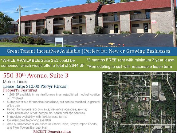 Suites available now! Build to suit available. Near Trinity Hospital, centrally located right off 7th St. Three separate suites are available, and two suites are joined by a hall that can double as an office for one of the two units. These two units could be combined (while available) to make one much larger suite (1378 SF & 1266 SF). The unit first in this listing is 1378 SF. Each suite has private bathrooms, a kitchenette, a waiting/reception area as well as an office and a private rear entrance. Large customer parking is attached with a huge employee parking area behind the building. High traffic flow building. Whether your business is new, or you've grown out of your current location this property can bring hundreds or even thousands of new clients to your door. Remodeling is possible with adjusted lease terms.