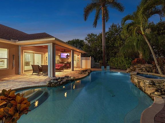 Resort living, redefined. Set on a private .54-acre estate lot at the end of a quiet cul-de-sac in Indian Oaks, this custom-built residence delivers the perfect balance of luxury, leisure, and lasting craftsmanship. From the moment you arrive, every detail feels intentional -- from the soothing wood-lined ceilings in the massive sunroom to the rich Acacia floors flowing through the open, split-floor plan that blurs the line between indoor comfort and outdoor retreat. Featuring four bedrooms including a private guest suite with ensuite/cabana bath, plus a versatile office/den, this home is designed to accommodate both relaxed family living and refined entertaining. The backyard is a showstopper -- a 5,000+ sqft sport court for pickleball or basketball, a resort-style heated saltwater pool and spa, and lush new landscaping framed by eight palms for added privacy. Evenings are spent fireside or poolside, where upgraded lighting automatically casts a soft glow across the tropical canopy. Inside, the home has been comprehensively updated (completed July 2023) for modern living. Every wall painted. Every light, fan, and outlet upgraded. Every bathroom reimagined with new tile floors, quartz counters, painted cabinetry, updated fixtures, and custom glass shower enclosures. The kitchen is the heart of the home fully refreshed with stylish accent cabinetry, a luxurious large tile backsplash, and elegant quartz countertops that tie the design together beautifully. Under-cabinet lighting, a wine fridge, state-of-the-art appliances, and a concealed power drawer complete the sleek, clutter-free finish. The family room now features a custom mantle and fireplace for relaxed evenings, while the home is also hardwired with Cat 5 for high-speed remote work and reliable streaming for your new favorite series. In the primary suite, enjoy direct pool access and a spa-level bath featuring a multi-head rain shower with body jets, custom tilework, and dual custom walk-in closets with built-in shoe and jewelry storage. Even the pool bath and outdoor bar were reimagined now featuring new sinks, faucets, and a beer fridge perfect for entertaining. Additional upgrades include a new roof (Feb 2023), new irrigation system and plantings, upgraded fence, and enhanced exterior lighting with photocells and timers for a seamless "always on when needed" ambiance. Less than ten miles from the beach, this meticulously updated home is a true turnkey retreat where refined design meets effortless comfort and every day feels like vacation.