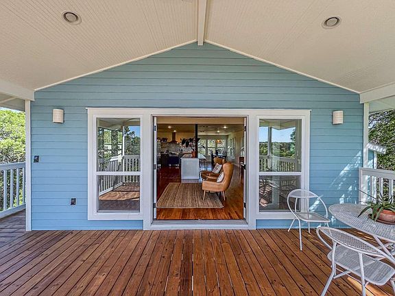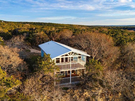The Clifftop Perch — a stunning, newly rebuilt retreat perched ~70 feet above the Blanco Riverbed in Wimberley. Enjoy panoramic sunset views from the expansive upper deck, relax in the window-wrapped living area with friends, or explore miles of dry riverbed trails below the bluff. Spring-fed swimming holes are a short 10-minute walk away. Set on 3 wooded acres with mature oaks and elms, this 1,720-sq-ft, 3-bed/2-bath home features two living areas, a screened porch, and a second-floor deck (~500 sq ft combined). The mid-century-modern kitchen includes a breakfast bar and induction range. A complete down-to-studs renovation finished in early 2024 replaced nearly everything–including utilities–while preserving select framing and foundation. For practical purposes, the home lives like a 2024 build with an effective age of 1.5 years. Detached, air-conditioned quarters (85 sq ft, on wheels) provide a private fourth bedroom tucked into the trees. The property extends below the cliff with house-sized boulders and small caves—ideal for exploring. Wildlife abounds, from deer to ring-tailed cats. Additional features include a discreet storage container, fencing, 42-inch porch deck rails, and high-speed cellular internet. Proven short-term rental averaging 4.95 stars on Airbnb (75 reviews). Located in Burnett Ranch with no POA restrictions, allowing future cabins or additional rentals.