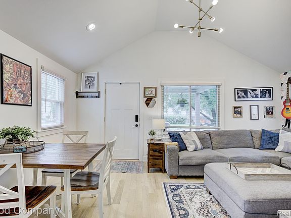 Charming and stylish Ferndale ranch with modern updates, a smart layout, and a fully fenced backyard perfect for relaxing or entertaining. Step onto the cozy covered front porch and into a bright, open-concept living and dining area featuring vaulted ceilings, warm hardwood floors, and tons of natural light. The beautifully updated kitchen offers a sleek two-tone cabinet design, stainless steel appliances, stylish pink patterned backsplash, and a spacious peninsula with bar seating. The adjoining laundry area is tucked neatly off the kitchen. Two comfy bedrooms boast vaulted ceilings and share a spa-like full bath with a custom tile shower, modern vanity, and gold-tone fixtures. Out back, enjoy a private, fully fenced yard with a storage shed, mature trees, and room to garden or entertain. All this just a short stroll from downtown Ferndale’s vibrant shops, dining, and nightlife. Welcome Home!