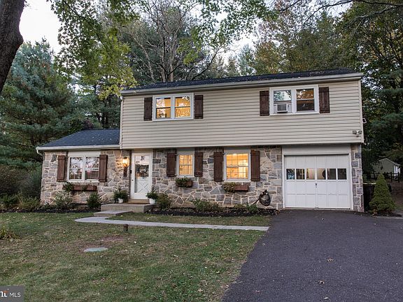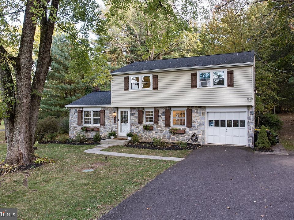Welcome to this beautifully updated four bedroom, one and a half bath Colonial set on a quiet and peaceful 0.69 acre lot. Surrounded by mature trees, this home offers privacy and a tranquil setting, while still being just minutes from local conveniences. The stone exterior with vinyl siding and a new roof (2020) gives this home timeless curb appeal. A driveway provides parking for five or more cars, in addition to the attached one-car garage. Step inside and you’re greeted by a warm and inviting living room featuring a stunning stone fireplace that matches the exterior, wood-beamed ceiling, a ductless mini-split for cooling and heating. The original hardwood floors have been refinished across the entire first floor. The heart of the home is the fully renovated kitchen featuring white cabinetry, quartz countertops, a marble tile backsplash, floating shelves, stainless steel appliances, and a farmhouse sink. The kitchen flows into the dining area and French doors leading to the stone patio and private backyard. A half bath completes the first floor. Upstairs, you’ll find four comfortable bedrooms, all with original hardwood floors, unique accent walls and new windows (2024), plus a full bathroom with a dual vanity, tub/shower combo, and newer laminate flooring. The finished basement adds even more living space with a cozy family room complete with built-in TV shelving, a separate office or bonus room with a closet, a laundry area, and additional unfinished space for storage and utilities. Enjoy the best of both worlds, modern updates and original character, in a serene, tree-lined setting. This move-in-ready home is a perfect retreat for those seeking space, comfort, and privacy - schedule your private showing today.