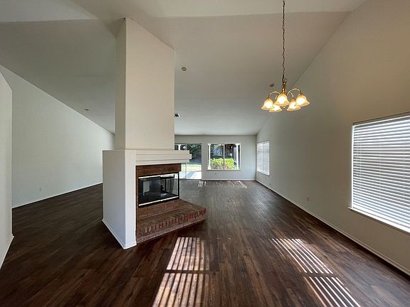 Single-story home with 2100sf in Wildflower community features vaulted ceilings, 3-sided fireplace in living room/formal dining room combo, tile countertops in family dining area and big kitchen with oak cabinetry, gas range, double-oven and dishwasher. The Master Bedroom has vaulted ceiling, sliding door access to patio & big wrap-around yard, and large walk-in closet with mirrored doors. Master Bath has dual-sink vanity, garden tub & separate shower enclosure. Other features include neutral carpet throughout home and recessed lighting. 2 Pets allowed with size and breed restrictions.