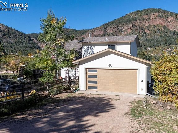 Welcome to a rare and remarkable opportunity nestled in the heart of Palmer Lake. The home is perfectly complemented by its expansive double lot, offering plenty of space for gardens, play areas, outdoor entertaining, or future expansion. The mature garden provides privacy while still allowing stunning views of the surrounding mountains, and the quiet Palmer Lake location gives you a serene retreat while still keeping trails, shops, and restaurants just minutes away. The main level features a bright and open living room with soaring ceilings and a cozy wood-burning stove, creating a warm and inviting atmosphere. A bedroom and convenient half bath are also located on this level, offering flexible space for guests or a home office. The kitchen is a chef’s delight, complete with a double oven and a charming ceiling-mounted pot and pan rack, perfect for both function and style. Upstairs, the spacious master bedroom opens onto a private balcony with amazing mountain views. An additional bedroom and full bathroom upstairs provide comfort and flexibility. This home also offers ample storage throughout, making it easy to stay organized and clutter-free. Whether you need space for seasonal items, hobbies, or everyday essentials, the thoughtful layout ensures you’ll always have room to spare. The home has new interior and exterior paint and brand-new carpeting throughout!