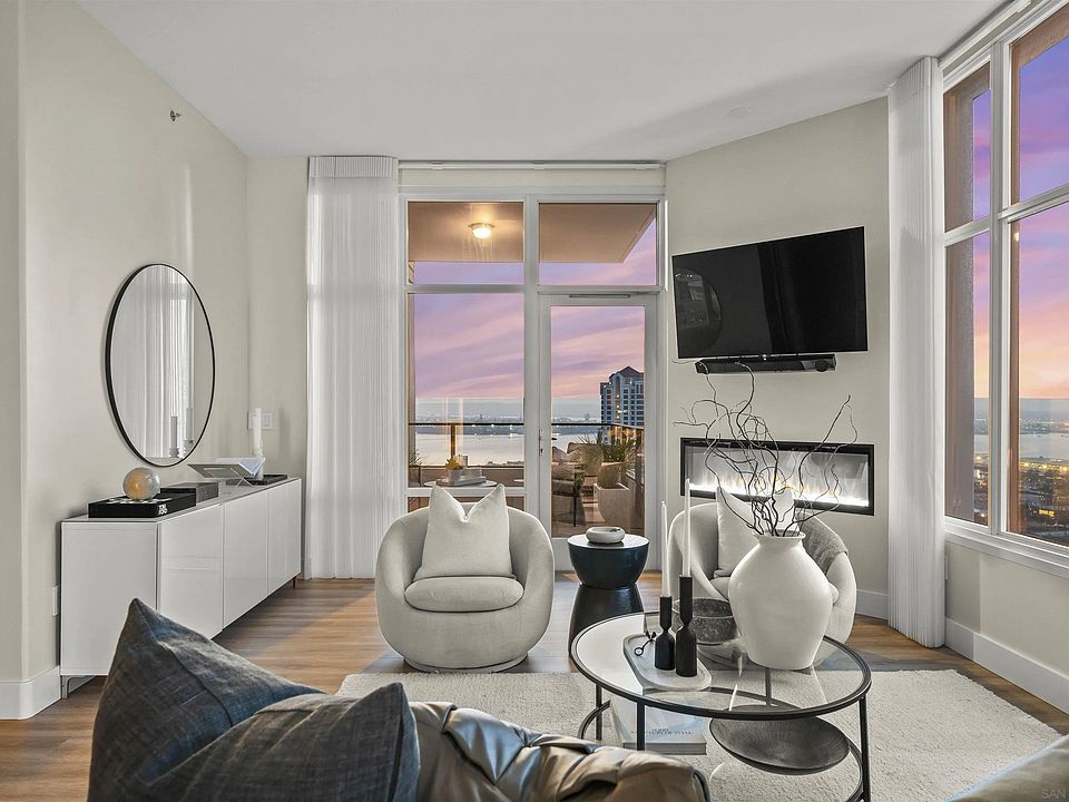 Step into luxury with this impeccably remodeled 2BR/2.5BA 23rd floor residence offering expansive West, North & East facing views! The grandeur of the space is accentuated by 10.5 ft ceilings + floor-to-ceiling windows, complemented by two private balconies perfect for soaking in San Diego's breathtaking sunsets, watching ships sail by, and admiring the views of Coronado Island and city lights. This residence has been recently remodeled with extensive upgrades including updated flooring throughout, modern kitchen cabinetry, Caesarstone countertops, state-of-the-art kitchen appliances + washer/dryer, California Closet built-ins, upgraded electrical + lighting, and more! Additionally, both bedrooms feature en suite baths that have been fully remodeled, and there's a separate powder room for guests. Moments from Seaport Village, The Rady Shell, Gaslamp District and Petco Park, Pinnacle offers white-glove concierge service, a world-class gym, steam and sauna facilities, a guest suite, a stylish lounge, a 95 ft lap pool + spa & more. Residence #2303 also offers two underground parking spaces and a storage unit. This home epitomizes sophisticated urban living, with every detail thoughtfully considered and upgraded.