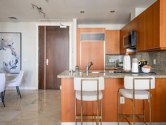 Downtown's safest, most well known luxury high-rise is The Pinnacle in the exclusive Marina District. This elegant 1 bed / 1 bath condo offers southern exposure with water views of the Coronado Bridge and San Diego Bay, framed by 10-foot floor-to-ceiling windows, a Pinnacle exclusive! Enjoy Snaidero Italian cabinetry, a built-in Sub-Zero fridge, Bosch appliances, and an instant hot water tap in the kitchen. This unit is the perfect urban escape or full-time residence, just steps from Seaport Village, Little Italy, Gaslamp, Petco Park, and the Rady Shell. Within the HOA fee all essential services are covered: security, water, resort-style amenities including a heated 95’ lap pool, jacuzzi, steam room, sauna, fitness center, library, a newly remodeled clubroom with cantina doors that open to an outdoor BBQ terrace and fire pit, concierge service, a guest suite for only $125/night, plenty of guest parking, and fun annual community events. Life at the Pinnacle just keeps getting better. From the tight-knit community feel to exciting new additions like Equinox and Javier’s, plus the Friday Farmers Market right outside your door - it’s no wonder people love calling this place home.