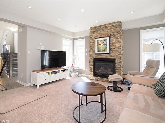 SIMPLY OUTSTANDING freehold townhome located on a child safe cul de sac. Fabulous unique design with all the bells and whistles, vaulted ceilings and upgrades galore. Natural sunlight fills every room of this END UNIT with gorgeous south west exposure. Inviting front foyer entrance leads to the upgraded kitchen/dinette featuring granite counter top with raised breakfast bar, all stainless appliances and stove vent, extended full length wall pantry. Cozy main floor living room highlighted by a full floor to ceiling stone gas fireplace. Stairs to upper floor landing that is large enough to provide the perfect home office work space. There are 3 spacious bedrooms, the primary has double closets and walk through access to the main bath. Convenient full size upper floor laundry closet saving you a trip down to the basement. The lower level has a finished rec room, 2pc powder room, utility and storage room under the landing. Enjoy those summer sunsets from the enclosed porch which leads to the back patio The backyard completes this home with a fully fenced landscaped yard with low maintenance artificial turf. There is also a rough-in for a future hot tub. Single garage has inside access to main foyer so you don't have to walk around to front. Handy location with super connection to Cambridge, Guelph and 401, steps to area schools and handy to all amenities. This one is move in ready for flexible possession in November, Call your Agent today to view and oh by the way, there are no monthly fees it's a freehold.
