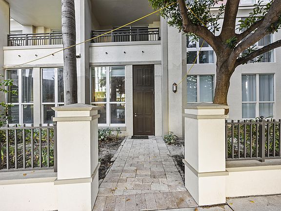 Unique ground floor walk-out with private exterior entrance & soaring 14-foot ceilings that make the already spacious 850 sq ft feel even larger. Unit 114 lives more like a townhome, with downtown WPB, CityPlace, dining and shopping just out your back door & full access to the building and amenities right out your interior, front door. Added perks include a first floor parking space, a first floor private storage unit down the hall, real wood floors throughout, newer AC, new Bosch dishwasher, faucets, ceiling fans, and Toto toilet. CityPlace South Tower has long been a premier residential building in the heart of downtown WPB that is structurally and financially sound. Building renovations, including lobby, pool area, social room & more, are scheduled to be completed by the end of 2025