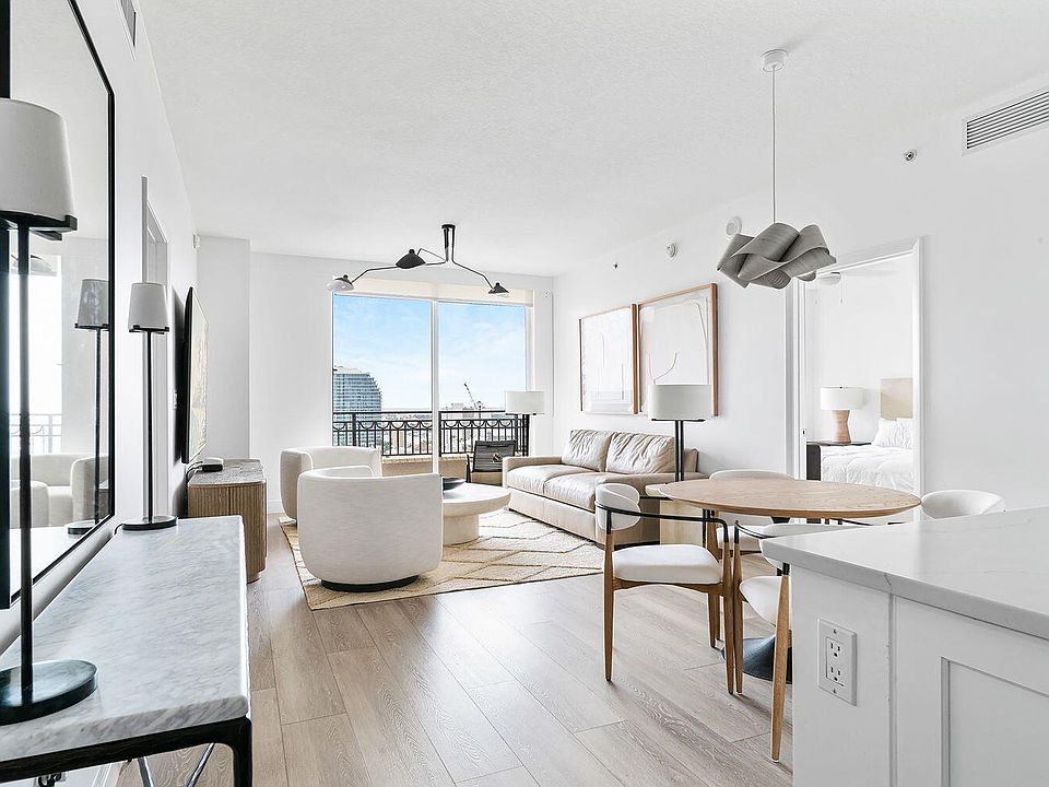 The perfect unit is ready for you this season. Spectacular direct Ocean and Intracoastal views from every room of this fully renovated, Upper floor 2 bedroom condo at the CityPlace South Tower. All new RH furnishings (seen pictured) can be included in the sale, or the unit can be purchased unfurnished as well. Also included are 1 parking space and 1 private assigned storage cage. Enjoy all of the buildings brand new updated common areas. CityPlace South Tower is a full service luxury building in the heart of Downtown with 24 hour doorman, valet, resort pool, gym, club room, and spa facilities. Located across from City Place (with new Equinox). Also walkable to many restaurants, the waterfront, Clematis St, Brightline Station, and Palm Beach Island just over the bridge.