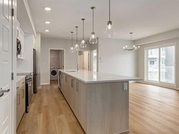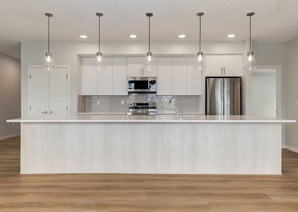 Introducing BELMONT PLAZA, a highly sought-after development in BELMONT, Calgary. BUILT BY CEDARGLEN LIVING, WINNER OF THE CustomerInsight BUILDER OF CHOICE AWARD, 5 YEARS RUNNING! BRAND NEW CORNER UNIT, "L4" floor plan with high-spec features. You will feel right at home in this well thought-out 1092.8 RMS sq.ft. (1165 sq.ft. builder size) 2 bed, 2 bath home with open plan, 9' ceilings, LVP flooring through-out (upgraded, no carpet), Low E triple glazed windows, electric baseboard heating, BBQ gas line on the patio, A/C Rough in, and Fresh Air System (ERV). The kitchen is spectacular with full height TWO TONE cabinets, extended island upgrade, quartz counters, undermount sink, S/S appliances and pantry. The extended island is stunning and transitions into the spacious living & dining area, perfect for entertaining. The spacious primary bedroom has a large bright window, sizeable walk-in closet and 4 pc ensuite with extra bank of drawers & full height tile upgrade. 1 additional bedroom located across the unit for noise reduction/privacy and 4pc bathroom (also with upgraded full height tile) located nearby. Laundry & storage closet is thoughtfully planned, definitely a must see (washer/dryer included). Highlights include: upgraded lighting package, sound reducing membrane to reduce sound transmission between floors, clear glass railing to balconies and 1 titled underground parking stall included. Steps away from shopping, restaurants and so much more. Belmont offers a vibrant neighbourhood that’s extremely well-connected through Calgary’s major arteries. Community living with inspired design. PET & RENTAL FRIENDLY COMPLEX.