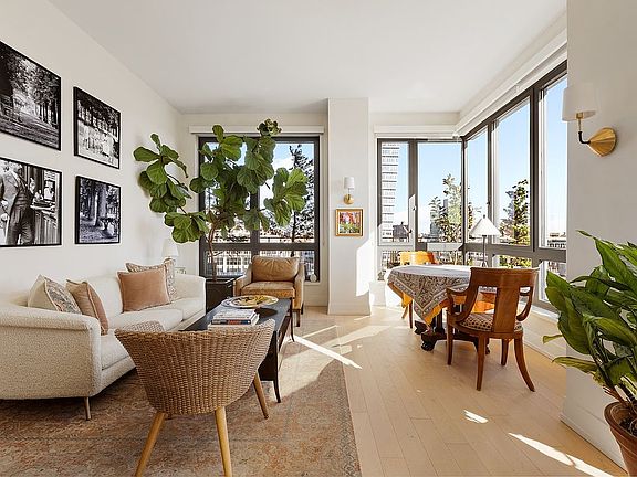 Floor-to-ceiling windows flood the 1308 square feet of the home with natural light, highlighting its elegant finishes and airy layout. The gourmet kitchen is a dream for both everyday living and entertaining, featuring a full suite of Miele appliances, sleek custom cabinetry, and a waterfall countertop island offering additional seating and prep space. A massive walk-in coat closet anchors the entryway, ensuring an organized and functional home.
