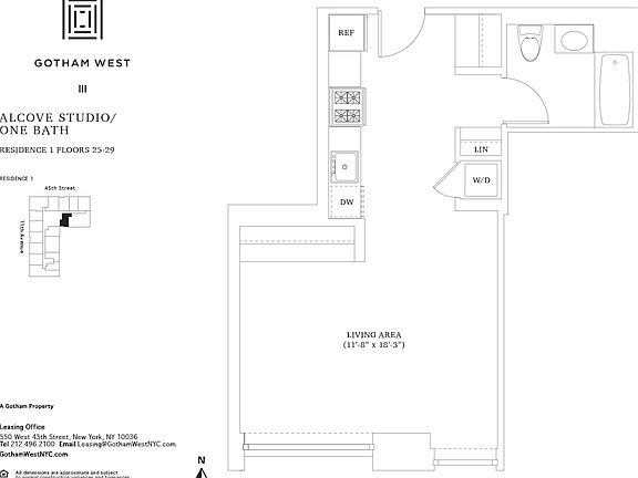 Situated in Midtown West, Gotham West is a no-fee luxury rental building and is your home that extends beyond your four walls, with a variety of exclusive indoor and outdoor amenity spaces designed to match the dynamic New York lifestyle: a game room to unwind, a test kitchen for cooking classes, a curated art gallery, a business center, and an unrivaled fitness center with spinning and yoga classes offered daily. Gotham Wests architectural details connects the indoors with large landscaped outdoor areas including The Perch, a serene second floor hide-away overlooking a large private courtyard. For unparalleled views, Gotham Wests intimate sky lounge opens onto a roof deck with a movie screen, misting wall, and places to socialize while overlooking the Hudson River. Life is easy at Gotham West with concierge services and shuttle service available.