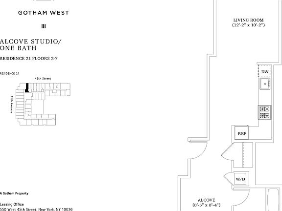 Situated in Midtown West, Gotham West is a no-fee luxury rental building and is your home that extends beyond your four walls, with a variety of exclusive indoor and outdoor amenity spaces designed to match the dynamic New York lifestyle: a game room to unwind, a test kitchen for cooking classes, a curated art gallery, a business center, and an unrivaled fitness center with spinning and yoga classes offered daily. Gotham Wests architectural details connects the indoors with large landscaped outdoor areas including The Perch, a serene second floor hide-away overlooking a large private courtyard. For unparalleled views, Gotham Wests intimate sky lounge opens onto a roof deck with a movie screen, misting wall, and places to socialize while overlooking the Hudson River. Life is easy at Gotham West with concierge services and shuttle service available.