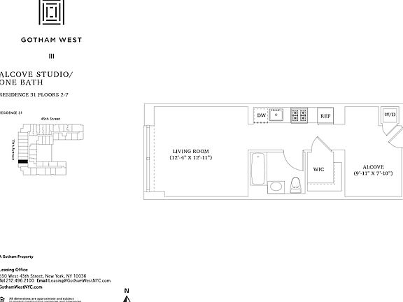 Situated in Midtown West, Gotham West is a no-fee luxury rental building and is your home that extends beyond your four walls, with a variety of exclusive indoor and outdoor amenity spaces designed to match the dynamic New York lifestyle: a game room to unwind, a test kitchen for cooking classes, a curated art gallery, a business center, and an unrivaled fitness center with spinning and yoga classes offered daily. Gotham Wests architectural details connects the indoors with large landscaped outdoor areas including The Perch, a serene second floor hide-away overlooking a large private courtyard. For unparalleled views, Gotham Wests intimate sky lounge opens onto a roof deck with a movie screen, misting wall, and places to socialize while overlooking the Hudson River. Life is easy at Gotham West with concierge services and shuttle service available.