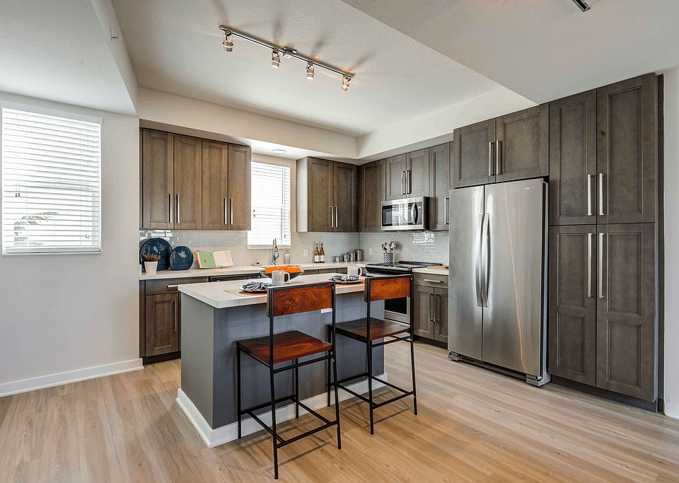 Luxe quartz countertopsSoaring ceilingsWood-style flooringHigh-end stainless-steel appliances