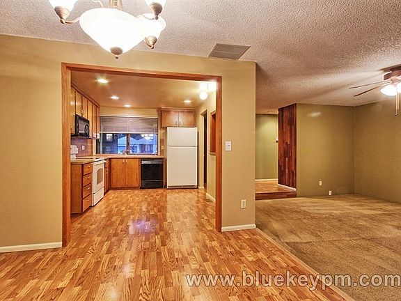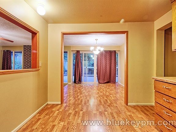 Inviting 3 bed, 2 bath home in Portland near Highway 26 with peaceful curb appeal. This home is on a quiet dead end road. It has a great open floor plan perfect for entertaining. There is a foyer entry and living room with a lovely fireplace and large floor to ceiling windows. It has a spacious kitchen with eat in nook and an additional large formal dining room with access to the backyard deck.. All of the bedrooms are spacious. The bathrooms have tile accents and floors plus tub/shower combo in the main shared bathroom. It has a master suite with high ceilings, large closet and bathroom with tile floors, tile accents and shower. A slider in the master suite gives access to the large backyard deck. Washer/dryer hookups. AC or heat pump. Small pet welcome to 40 lbs max weight. $800 refundable pet fee per pet. Call Blue Key Property Management, Inc. $2650 Rent, $2650 Security deposit, $55 non refundable screening fee per adult age 18 and older. $800 additional refundable deposit per pet if pets allowed. Renter's insurance required. Blue Key Property Management, Inc. licensed in WA and OR. 5500 NW Ridgemoor Court, Portland, OR 97229