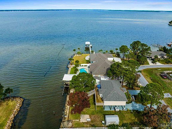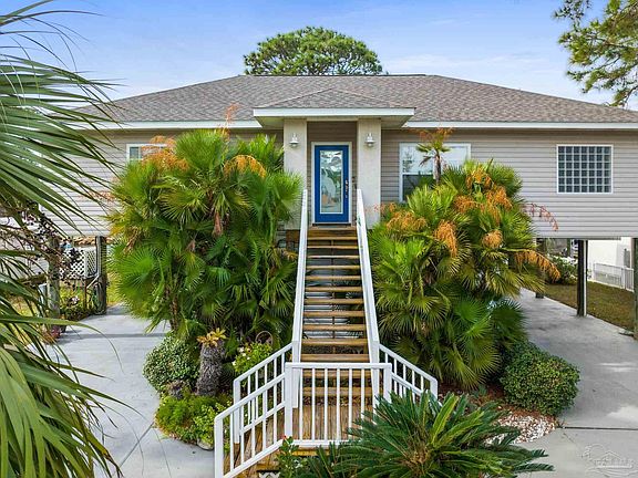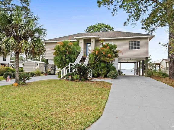 Custom-built home ON THE WATER! Back on the market at no fault of sellers! Located on Perdido Bay near Perdido Key and NAS, this waterfront property is totally move-in ready and has no HOA. The house offers over 2,200 square feet between the main level and the bonus room downstairs. Inside is a wide open floorplan with large windows overlooking the awe-inspiring waters of the canal and bay beyond. The open great room, dining area, and kitchen are all connected by soaring cathedral ceilings with plant ledge details. The contemporary kitchen features black granite counters over the custom oak cabinets and breakfast bar. It also has stainless steel appliances, a stone backsplash, and built-in pantry. Split from the guest bedrooms and bathroom is the private master suite. With french doors to the deck and an amazing attached bath, it's a true retreat. Speaking of the amazing ensuite bathroom, it offers a jetted tub and walk-in shower, plus a huge vanity for extra storage. Downstairs is a heated and cooled bonus room with a half bath that could be easily converted to a full for a potential in-law suite, or add a pool table for a great game room. The stunning water views can be enjoyed from numerous spots like the back deck, screened porch, or the private boat dock!! Need more storage? There's a powered shed in the side yard to house all of your boar or lawn equipment.