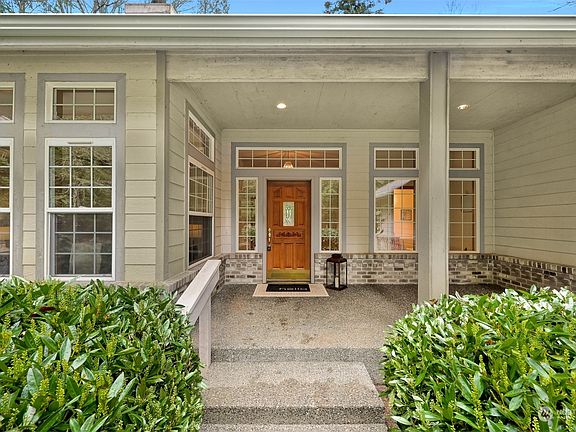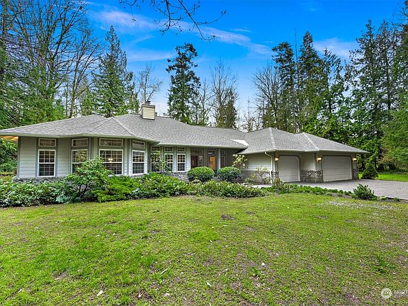 Timeless custom one-level home with a 3-car garage. Sited on a private 4.5 acres. Lovingly-maintained, a one-owner home. High ceilings and large windows bring in the natural light framing the natural setting. Beautiful scale with generous spaces. Covered front porch. Foyer with a powder room. Family room with a fireplace. Den with French doors includes a double-sided fireplace + French doors leading to backyard. Living room with a fireplace and opens to the kitchen nook and a culinary kitchen. Entertaining kitchen features a large island, seating bar and huge walk-in pantry. Dining room. Primary with with a jetted tub, double vanity and walk-in closet. Opens to large back patio. This home exemplifies the PNW lifestyle and just minutes town.