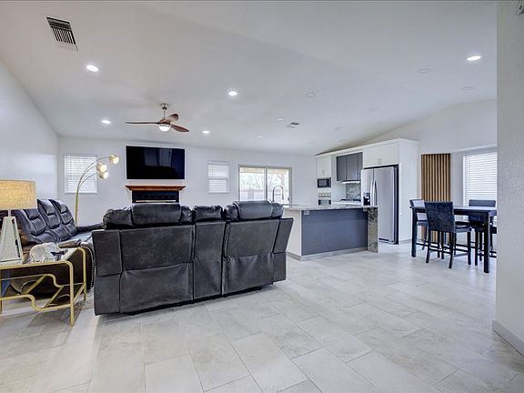 Welcome to this stunning 3 Bedroom 2 Bathroom home located in the vibrant city of Tucson, AZ. This home boasts a spacious layout with tile throughout, enhancing the modern aesthetic. The open concept kitchen and dining room, complete with a kitchen island and nook, are perfect for entertaining. The kitchen is equipped with stainless steel appliances, adding a sleek touch to the space. Each bedroom is fitted with a fan for your comfort. The master bedroom features a double sink vanity for added convenience. The home comes partially furnished, ready for you to add your personal touch. The property also includes a washer/dryer, a two-car garage with an extended driveway for additional parking, and a large enclosed backyard with a turf area for outdoor enjoyment. Relax on the covered porch or cozy up by the fireplace on cooler nights. This home is a perfect blend of comfort and style.