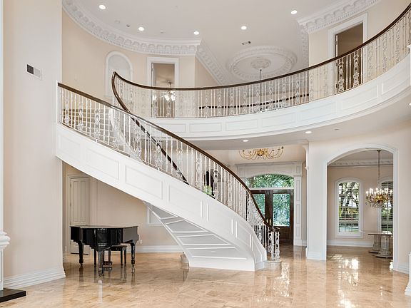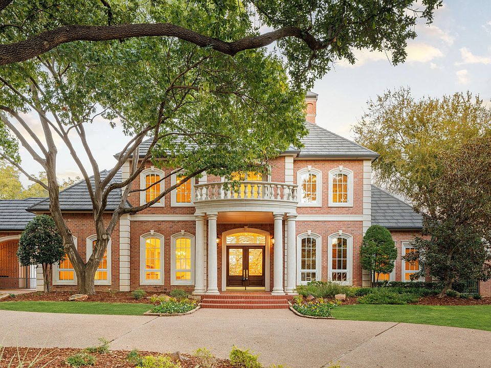 Tucked away on a quiet cul-de-sac surrounded by lush, mature trees, this breathtaking traditional estate offers more than 9,000 square feet of refined living overlooking the 12th fairway of the Gleneagles Queen’s Course. A circle drive, grand double-leaded glass doors, and manicured landscaping set the stage for the sophistication within. Inside, the home impresses with soaring ceilings, marble floors, and intricate crown molding. Sunlight floods through expansive windows framing sweeping views of the pool, creek, and rolling hills beyond. A dramatic curved staircase greets guests in the foyer, while the formal living and dining spaces are complemented by a butler’s pantry with built-ins—perfect for entertaining in style. The den, featuring a stately wood coffered ceiling and wet bar, looks out to tranquil golf course views. A game room with a second wet bar offers the ideal space for relaxed gatherings. The gourmet kitchen is a true centerpiece with Thermador and GE Profile appliances, a massive island, a FiveStar commercial-grade 6-burner cooktop, double ovens and dishwashers, and new custom cabinetry throughout. The primary suite provides a sanctuary of luxury with a sitting area overlooking the greens, a cedar closet, and a spa-like bath with a freestanding tub, marble shower, dual vanities and toilets, and a bidet. An upstairs secondary suite includes one ideal for a secondary study and a second primary in-law suite with a balcony and fireplace. Beyond the interiors, enjoy a resort-style outdoor experience with an expansive pool deck, lush play yard, and full pool bath. Thoughtful details abound, from two front and two rear gated porte cocheres to a potting room workshop off the garage and a back staircase for convenience. An extraordinary blend of craftsmanship, comfort, and setting—this estate captures the essence of luxury golf course living in one of North Texas’s most prestigious communities.