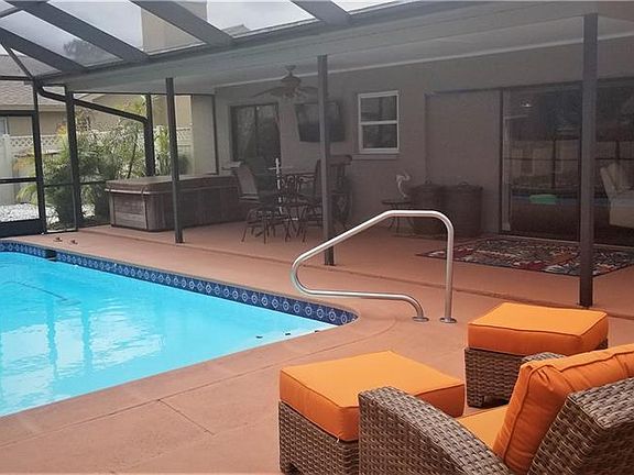 This is a 3 bedroom, 2 bath split floor plan situated on a corner lot. Throughout the foyer, kitchen and great room is ceramic tile which looks like hardwood flooring. The kitchen was recently remodeled with all new appliances including a convention/convection oven with induction stovetop. Pocket sliding doors open to the pool area, which includes a free standing spa. There are two waterfalls on both sides of the pool lanai, koi pond and large patio with fire pit covered by sail shades.