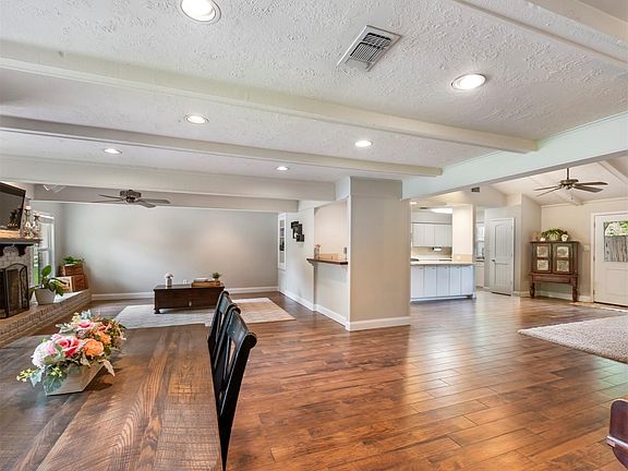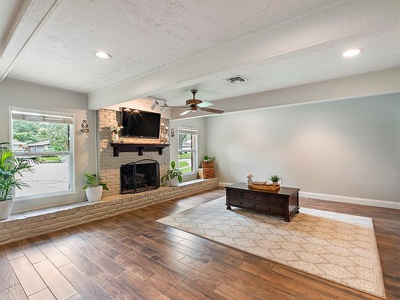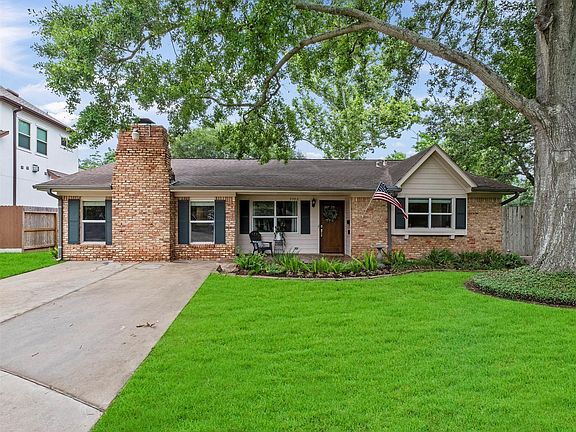 This updated traditional style home rests on a charming oversized, beautifully treed cul-de-sac lot. Ceiling beams and the cozy brick/ gas log fireplace with hearth seating immediately catch the eye upon entering, along with the recently installed gorgeous wide plank wood flooring. Fresh paint, recesses lighting, and openness in the family area give the home a bright spacious feeling. The kitchen has an oversized breakfast bar, wet bar, stainles sink, corian counters, and gas range. The double doors lead out to a charming patio with an oversized yard that wraps around, containing a small blue barn-style shed. Herod Elem and Bellaire High Schools