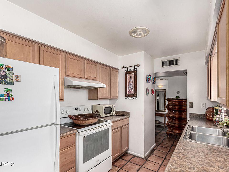 If you love old-school charm & classic Saltillo tile floors, this is the home for you! This well-maintained 2-bedroom, 2-bath residence offers comfort, character, & convenience in one of Mesa's most sought-after 55+ neighborhoods. Step inside to find neutral paint tones, a spacious kitchen w/matching appliances, ample cabinet space, & a pantry for extra storage. The primary suite features a walk-in closet & private bath, while the attached garage includes laundry, storage space, & a carport for additional parking. Enjoy Arizona living in the easy-care backyard, complete w/desert landscaping, a covered patio, & a detached storage shed equipped w/its own A/C unit—perfect for a home office, craft room, or hobby space. Recent updates include a new water heater (2024) and a replaced main line from the house to the septic (2024), offering peace of mind.