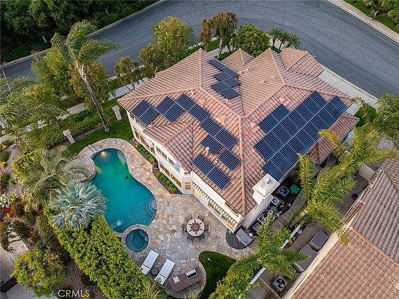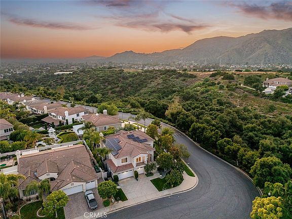 STUNNING POOL HOME IN THE LA VERNE HEIGHTS GATED COMMUNITY. This exceptional residence exudes a fully paid solar system and exudes elegance from every angle, starting with its beautiful curb appeal and professionally landscaped grounds and the front porch offers a cozy courtyard with paver decking. As you enter through the double doors, you're greeted by a grand tiled foyer with soaring ceilings that lead you to an impressive staircase and the sophisticated living and dining rooms. The living and dining room offer Longcraft oak flooring, multiple windows, and a mirrored accent wall in the formal dining room that overlooks the backyard. The kitchen is a true open concept, featuring classic white cabinetry, granite countertops, stainless steel appliances, a functional prep island, and a cozy breakfast nook with serene backyard views. Adjacent to the kitchen, the family room serves as a perfect gathering space with its warm granite fireplace, media niche, and open layout. The first floor also includes a convenient bedroom currently set up as a gym, an updated bathroom with a custom-tiled shower, and an indoor laundry room complete with ample storage and a sink. Upstairs, the primary suite is a true sanctuary, offering panoramic views, individual climate control with a mini split system, a spacious retreat with a fireplace, elevated bedroom, and a remodeled primary bathroom. The primary bathroom features custom vanities, a clawfoot tub overlooking the landscape, a custom shower with a glass enclosure door, and a walk-in closet with a professionally designed organizer system. The versatile loft counted as a fifth bedroom could be game room or bonus room. Complete with a view balcony, its own mini-split AC, and walk-in closet. Two additional bedrooms and an updated hall bathroom with dual sinks complete the upper level. Outside, there is a pool and spa, built-in BBQ, flagstone decking, grass areas, and an elevated sitting area with stunning views providing an ideal backdrop for entertaining or private enjoyment. There are automatic electronic shades throughout the home. This gated community not only offers a secure residence but also features a park with tennis, pickleball, and basketball courts, a fountain, a playground, and picnic areas, ensuring a lifestyle of both luxury and convenience. Attending the highly rated Oak Mesa Elementary, this home is a rare find for discerning buyers seeking a blend of style, comfort, and exceptional community amenities.