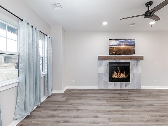 Welcome home to this gorgeous contemporary like brand new ranch with no Specials! The covered porch with zero entry greets you warmly as you walk into this open floor plan. In the kitchen, sparkling granite counters show off the spacious island where you can enjoy soft close cabinetry and all of the shiny stainless appliances. The primary bedroom features it's own ensuite with walk-in and linen closets. You'll love the hanging bar and folding counter in the laundry room as well as the shelving. Irrigated privacy fenced yard is waiting for your personal touches with plenty space for a garden or play area or pool; your possibilities are endless! Make sure you check out the firepit entertaining area too!  The large garage includes the electric water tank and furnace in it's own room, plenty of wall space to organize all your accessories, and the lawn care equipment & mower stay with the home! Get your green thumb ready! Before you leave, notice the main hall bathroom is your very own concrete storm room for your safety. Make this house your home today!