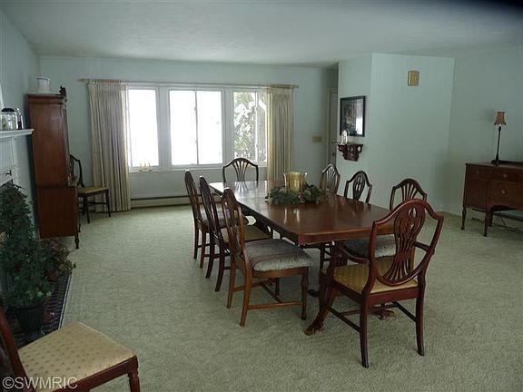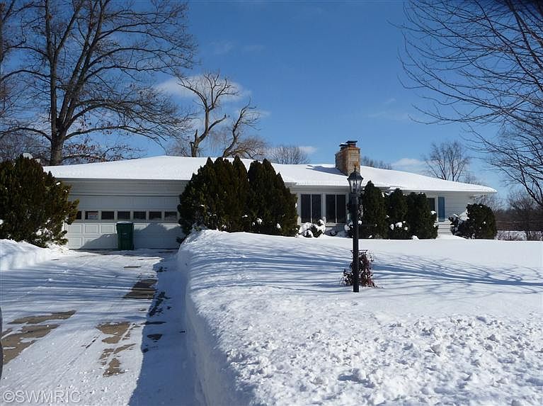 Spacious ranch with its own private pond that has a bridge to an island and decorative lighting. Huge living room with gas log fireplace and plenty of natural light. Open floor plan, functional kitchen with eating area and replaced cabinet fronts. Main level bedrooms have double closets and beautiful hardwood floors. Finished walkout level features full bath, family room with fireplace, bedroom, kitchenette and storage. Large cement room under garage used as a storm shelter. Three season porch with view of pond and backyead. Attached 2 car garage and storage shed with electricity. Other features are replacement windows on main floor, Anderson windows on lower level, 200 amp service with room to add, RV plug (30 amp) in backyard and outdoor outlets. Located on 1.4 acres close, easy drive to US 131.