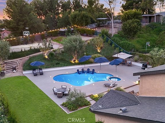 Step outside and you'll discover a resort-style paradise. A newly remodeled saltwater pool and spa with a Baja step and underwater lighting is the centerpiece for outdoor gatherings. Above the main yard, a second-level space features a sports court, a paved area, and a private gate to horse trails. Mature avocado, lemon, and lime trees provide fresh fruit. Around the property, you'll find tranquil spots with fountains, olive trees, and topiaries, perfect for your morning coffee.
