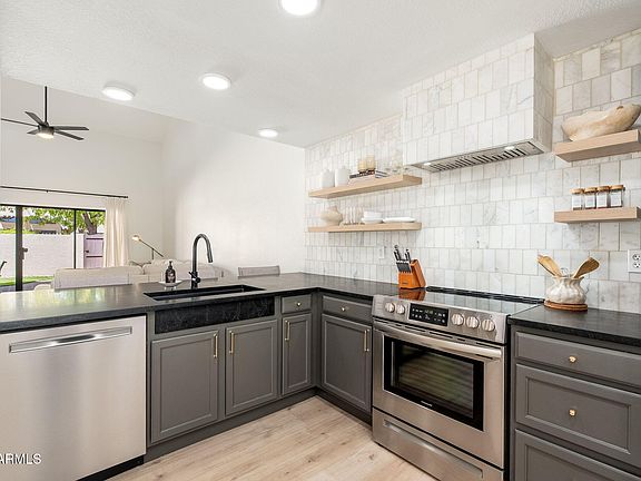 Discover this beautifully remodeled townhome in the highly desirable Alta Mesa community in Mesa, Arizona. Designed with both comfort and style in mind, this home features white oak floors, bright open-concept living, and tastefully updated contemporary kitchen and bathrooms. The neutral tones and modern textures create a timeless aesthetic, while large windows bring in natural light. Step outside to a spacious backyard with extended paver patio, perfect for entertaining or relaxing under the shade of mature trees. Enjoy a private gate with direct access to the sparkling community pool and stroll along Alta Mesa's lush, tree-lined walkways. This property offers the perfect blend of low-maintenance living and resort-style amenities in one of Mesa's most sought-after neighborhoods.