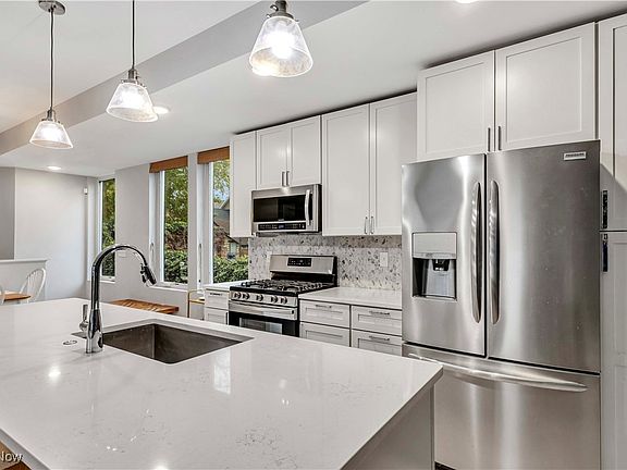 Experience Lake Erie luxury as your home! The property has a lucrative tax abatement through 2036. Schedule a tour for more information. Situated on top of a small hill, this is one of the few townhomes in Cleveland with breathtaking panoramic views of Lake Erie as well as views of the city skyline. Situated in the heart of the rapidly developing Gordon Square neighborhood, you're steps away from some of the best restaurants in The Land and Edgewater Park. The property features three levels of living with one of the largest private rooftops to be found in Cleveland. Beautiful hardwood floors and striking hexagonal tile run throughout the home in addition to stylistic accent walls. Stainless steel appliances in the kitchen and gorgeous quartz countertops throughout the home. The massive windows throughout bathe the home in natural light for all hours of the day. Enjoy the convenience of a two car garage as well.