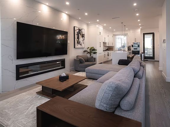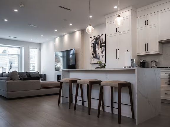 Located on a desirable corner lot, this beautifully fully furnished 3-bedroom, 3-bathroom home offers exceptional natural light and 9.5 ft ceilings. Features include A/C, radiant heat, engineered hardwood floors, security system with cameras, hot water on demand, built-in vacuum, and closet organizers. The sleek kitchen boasts Bosch integrated appliances, quartz counters and backsplash, 36" gas stove, and a waterfall island with wine fridge. 1 EV parking stall included. School catchments: Tecumseh Elementary & Gladstone Secondary. Contact us today to arrange your private viewing.