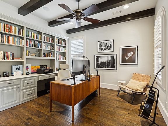 Located in the coveted Mockingbird Elementary attendance zone, this 2013 J. Gregory-built home blends classic Dallas charm with modern functionality. A formal entry opens to an elegant dining room and a private office with custom built-ins. The open-concept design features a chef’s kitchen with quartzite countertops, double ovens, gas range, butler’s pantry with ice maker, and a large walk-in pantry—all overlooking a light-filled breakfast room and living room with a wall of windows, fireplace and a stylish wet bar. The first floor also includes a guest suite with a full bath, while upstairs offers a spacious game room with wet bar and wine storage, along with a utility room with sink and walk-in attic access. The luxurious primary suite boasts marble tile, jetted tub, separate shower with dual shower heads, and an oversized walk-in closet. Two additional bedrooms share a Jack-and-Jill bath. Designed for year-round enjoyment, the backyard is fully turfed and features a putting green, covered patio with fireplace, and a built-in grill station. A detached two-car garage with electric gate completes this thoughtfully designed property.