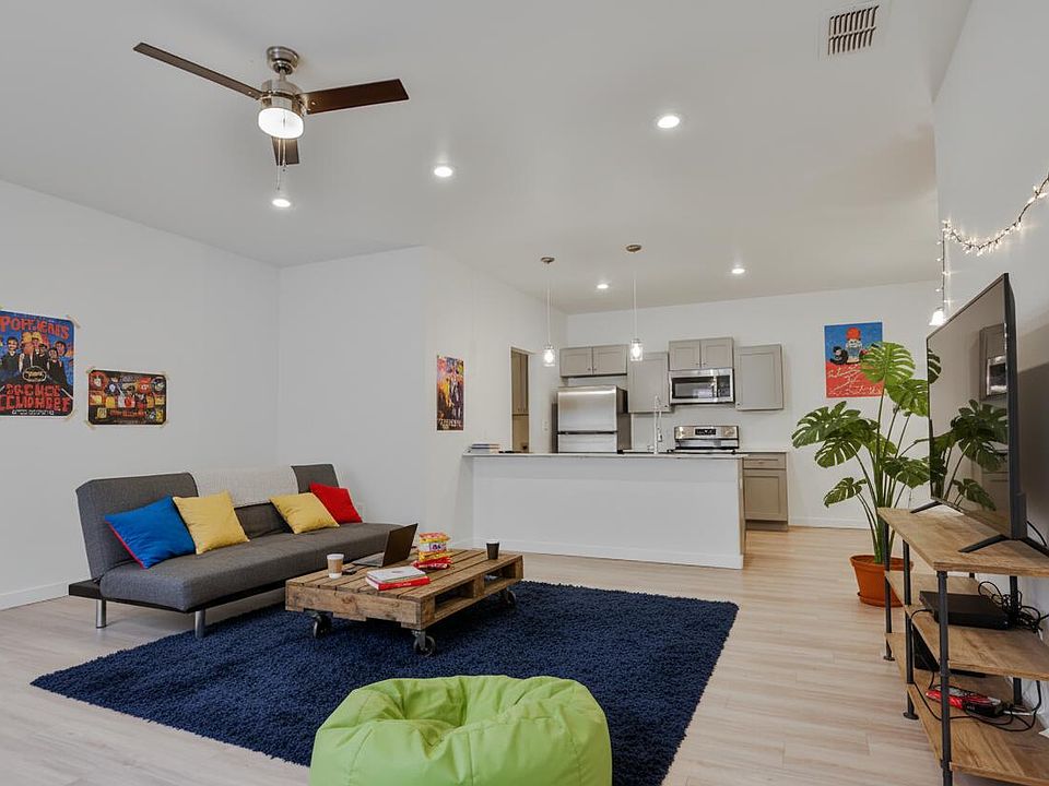 Modern living spaceStainless-steel appliancesGranite countertopsVinyl flooringGourmet kitchen