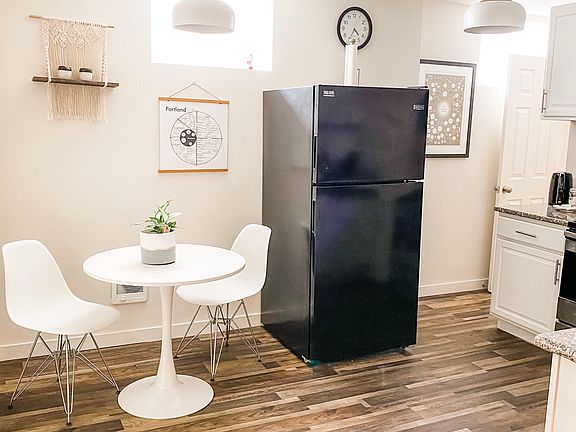 This cozy, fully furnished three-bedroom, one-bath (plus bonus room) North Tabor duplex is full of charm with hardwood floors, a full kitchen, two fully furnished bedrooms. The full kitchen boasts granite countertops, a dishwasher, microwave, full refrigerator, and under sink water filter. The floor plan features two fully furnished bedrooms with queen size beds, the third room set up as an office, and a bonus room features a couch and smart TV. This pet-friendly NE Portland duplex also has a large, fenced back yard, patio area for entertaining outdoor options, and an in-unit washer/dryer. Other convenient perks include a smart Ring video doorbell and smart door lock. The spacious basement unit in the duplex has its own private entrance and fenced yard access (pets welcome).