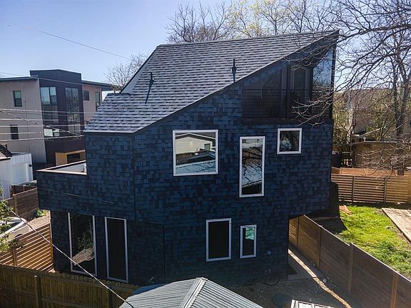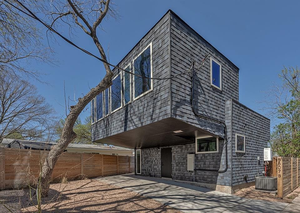 Coolest Property Ever! The Twin Treehouses, designed by award-winning architect Nicole Blair, offer striking modern design across three levels. The angled structures maximize privacy and sightlines while framing views of the landscape and neighborhood. A side-yard walkway provides easy access for parking, guests, and mail, while an alley entrance leads to the carport and private entry. Inside, the home combines architectural flair with a warm, livable feel. Expansive windows with roller shades bring in abundant natural light. The entry level includes a spacious bedroom with polished concrete floors, high ceilings, built-in closet, and a sleek full bath with large shower. The second level features the main living area with hardwood floors, angled ceilings, a wall of built-in storage, granite counters, island seating, and an open connection to the living room. This floor also includes a sunlit bedroom, full bath, laundry, and access to a generous balcony. A sculptural staircase leads to the third level, where a lofted flex space—perfect for an office or workout area—opens to both a serene balcony and a screened-in porch. 1-car carport provides locked storage and an electric car charging station. This Twin Treehouse is located in the highly sought after neighborhood of North Loop, close to restaurants and shops in Hyde Park and North Loop. This property is currently active as a STR and can come fully furnished.