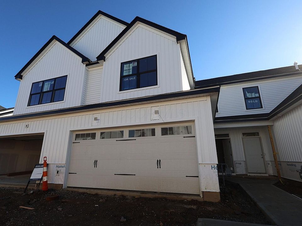 Highlights include a striking exterior with white vinyl siding and black accents, 2 bedrooms, 2.5 bathrooms, an attached 2-car garage, an open kitchen and family room, a back patio, storage closets throughout, a second-floor laundry room, an attached owner's bathroom with a walk-in closet, and more!