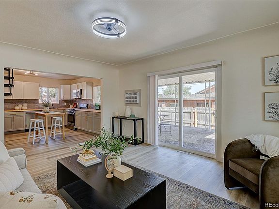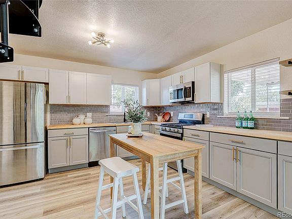 This beautifully updated 3-bedroom, 2-bathroom home in Commerce City, CO, offers thoughtfully designed living space, plus a spacious upstairs loft that serves as a versatile third bedroom or bonus area. The open loft features clever storage cubbies and includes four single beds with linens, perfect for envisioning a cozy kids' retreat or guest space. A stylish spiral staircase adds modern charm. The stunning new kitchen boasts sleek cabinets, butcher block countertops, a new microwave, and dishwasher, paired with a gas stove and refrigerator. Fresh vinyl plank flooring flows through the downstairs, including both bedrooms, with plush carpet in the upstairs loft. Enjoy fresh interior and exterior paint, a wall AC unit downstairs, and both a window AC and freestanding AC in the loft for year-round comfort. The private, fenced backyard with alley access and parking includes a storage shed, covered patio, and inviting front porch. Ideally located near parks, Northfield High School, shopping, and easy access to I-25, I-70, and 270, this move-in-ready home blends modern updates with unbeatable convenience.