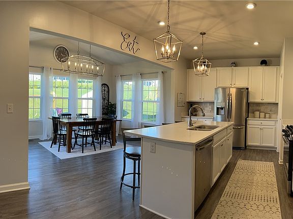 This 3 years young, stunning, 3 bedroom 2.5 bath home boasts beautiful custom updates through out and gorgeous views. This home has just about 2,700 square feet of living space and an open floor plan with kitchen, dining and living room. The dining/morning room has a vaulted ceiling and all the natural light you could ask for, with the rest of the main floor having 9’ ceilings. Gorgeous kitchen with quartz countertops, marble backsplash, a large walk-in pantry, and Island with plenty of seating space. Kitchen connects to mud room with washer and dryer. There is another room that can be used for a variety of different options, along with a half bath. Upstairs there are 3 bedrooms and a loft space that could be converted to a fourth bedroom. The basement has more than 500 square feet of finished living space and a roughed in bathroom space along with plenty of storage on the unfinished side. The garage is finished as well with a beautiful epoxy floor and sheet-rocked, painted walls. Last but definitely not least their is a large stamp- crete patio out back with pergola and a matching custom stamp-crete walkway at the front entrance.