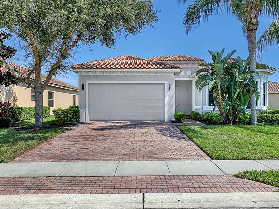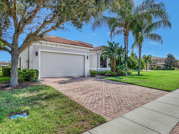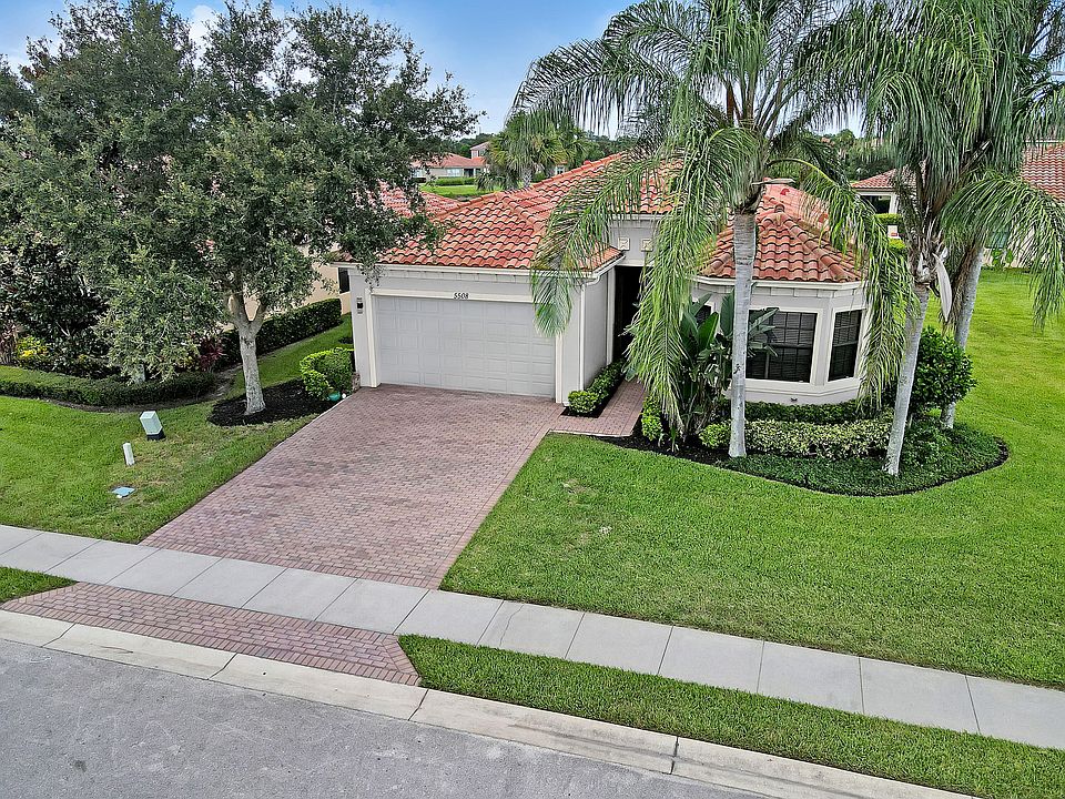 Captivating Mediterranean-style home on a corner lot with peaceful LAKE VIEWS in the gated community of VeroLago. This pristine 3/2/2 home boasts a Beautiful exterior with Manicured Lawn & Lush Landscaping! Step inside to a flowing open-concept layout that emphasizes the Scenic beauty of the lake. High Ceilings, IMPACT WINDOWS, Crown Molding, Chef's Kitchen with SS Appliances, Granite Countertops, Seated Bar & Breakfast Nook. Spacious Living Rm & Dining Rm. Relax in the Covered Lanai & Enjoy the Lake View & Breathtaking Sunsets! Owner's suite offers His/Hers Walk-In-Closets & Vanities, Soaking Tub. New Carpets. Freshly painted inside & out. Epoxy on Garage Floor! Dining Rm could convert to den/office. Low HOA fees! Minutes from Beaches & Shopping. A MUST SEE!
