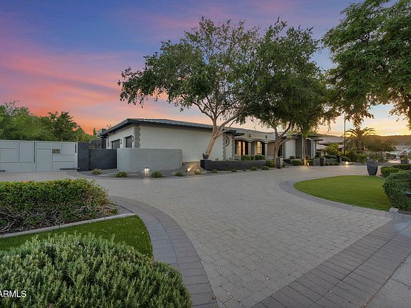 A stunning blend of elegance, function, and thoughtful design at every turn. A paved brick driveway and curated desert landscaping create an impressive entrance, and even the steps leading to the custom front door are softly lit—one of many details throughout. The home has been freshly painted inside and out, giving it a crisp, updated feel from the moment you arrive. Inside, tall ceilings, warm natural tones, and new wood flooring in the main living areas create an inviting and refined atmosphere. The formal dining area transitions seamlessly into the main living and kitchen space, where a disappearing wall of glass brings the outdoors in. A glass-enclosed staircase serves as a striking architectural focal point leading to the basement. The gourmet kitchen is exceptional, offering two oversized islandsone with seating for six and the other designed for prep and entertaining. High-end stainless appliances, sleek quartz countertops, and custom cabinetry complete the space.