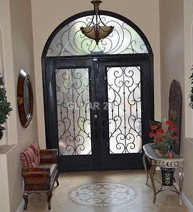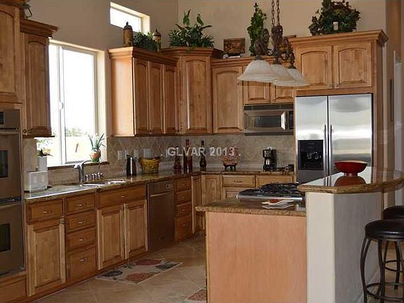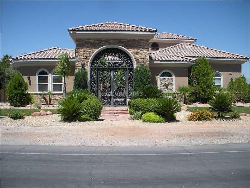 Gorgeous Custom single story with view of the strip. Located in a quiet rural setting, minutes from everything, no HOA. This unique home welcomes you with a stunning wrought iron gate entrance that leads thru private courtyard.Home features travertine floor, 2nd master, high ceilings, granite, SS appl, 2 tone paint.Back yard features balcony that leads to covered look-out tower, elegant pool with solar heater, RV parking.
