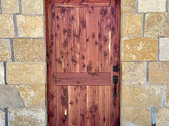 The exterior is clad with thick Texas Limestone. The interior walls and ceiling are sided with Doug Fir paneling that I purchased from an Amish mill in Antonito, Colorado.